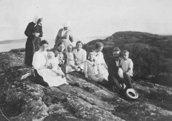 Askeröbor och sommarboende på utflykt i ett berg på södra delen av Stora Askerön ca 1918.