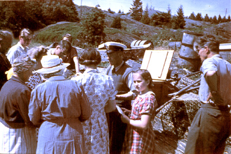 Edvin Asker delar ut posten vid byggan på Stora Askerön. Foto S-E. Kranse 1950.