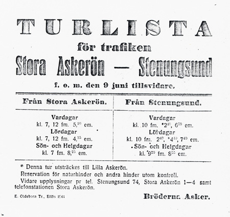 Bröderna Asker öppnade på 1920-talet reguljär trafik med motorbåtar mellan Stenungsund och Askeröarna