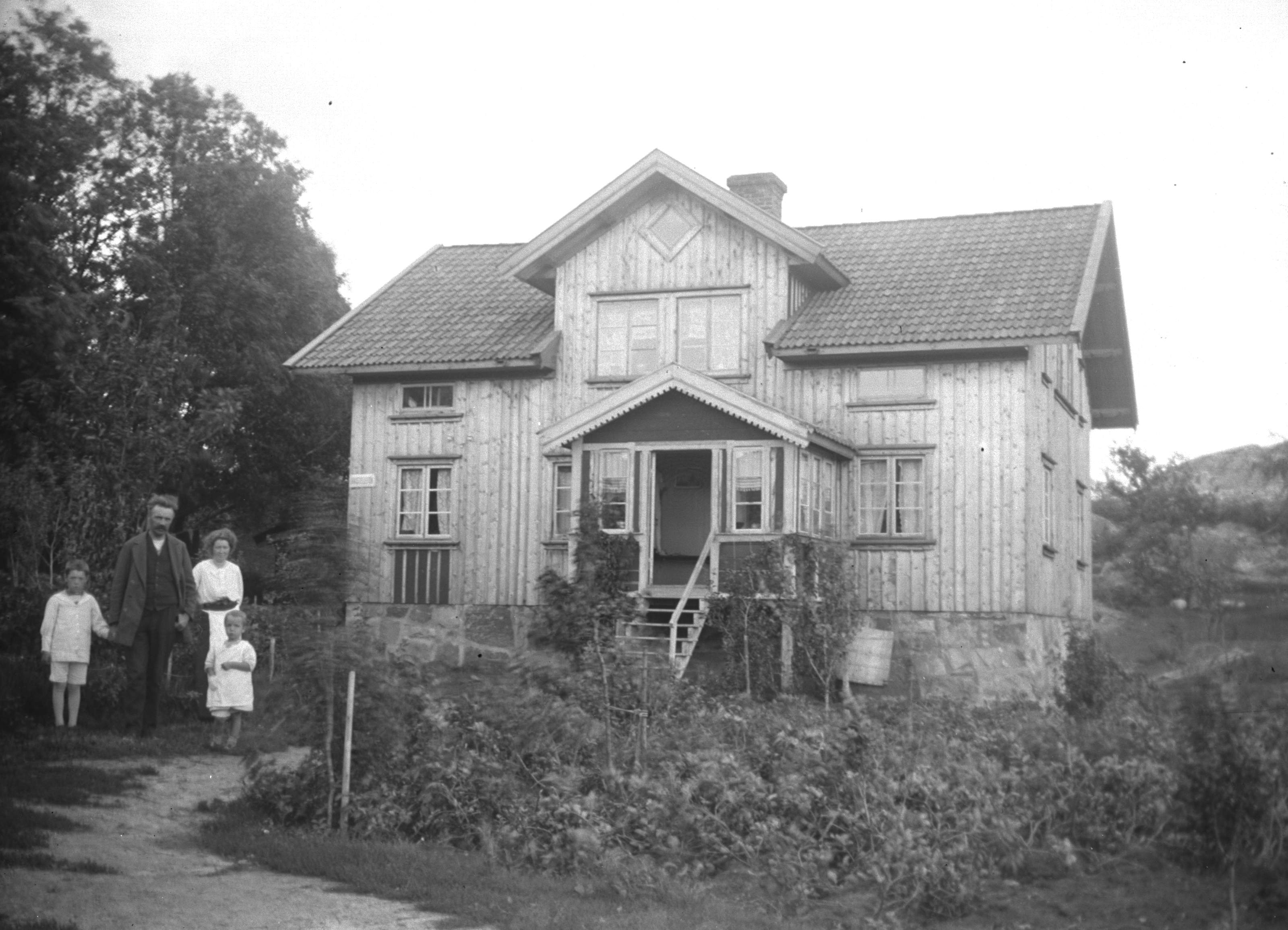Sven Asker flyttade från Knarrudden på Lilla Askerön 1914 och köpte en gård i Östergård på Stora Askerön. Här ses det nybyggda manhuset och brädklädseln är ännu inte riktigt färdig. I första våningen t.v. finns en skylt som anger att det finns “Rikstelefon” indragen d.v.s. samtalstelefon för allmänheten. Utanför står sommargästerna folkskolläraren Hakon Långström, hans hustru och deras två söner Tage och Bertil. Foto I. Pettersson 20 aug. 1917.