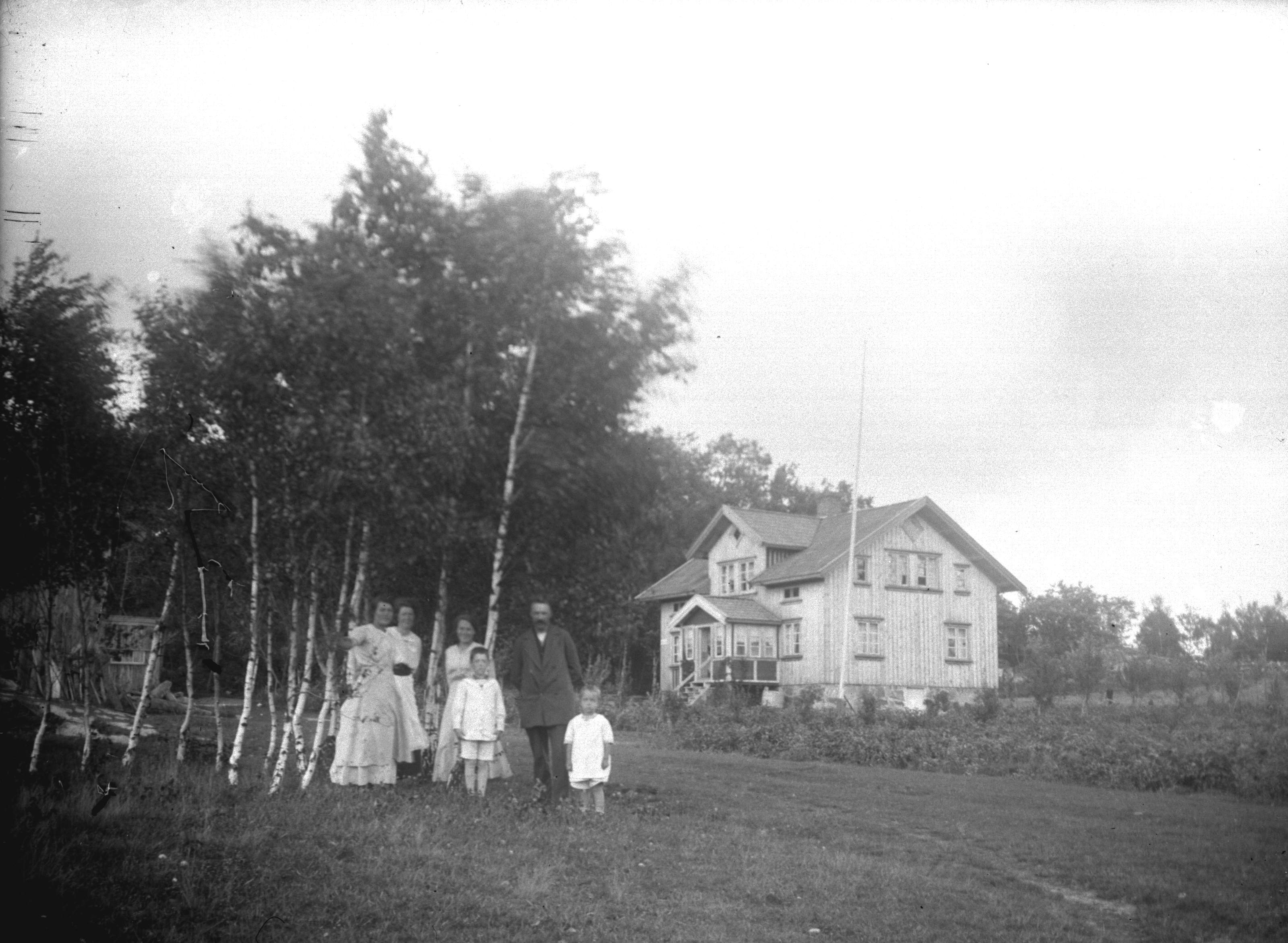Familjen Långström och två okända damer framför Sven Askers hus den 20 aug. 1917. Stora Askerön. Foto: I. Pettersson.